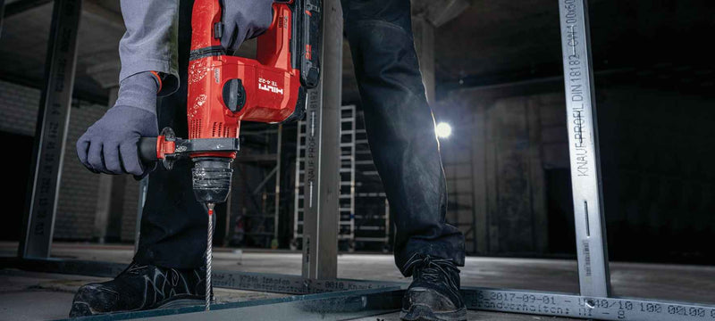 - Kompakt, aber sehr leistungsfähig – die beste Balance zwischen Verhältnis von Leistung zu Gewicht, Bohrgeschwindigkeit und Laufzeit pro Ladung aller Hilti SDS Plus Bohrhämmer