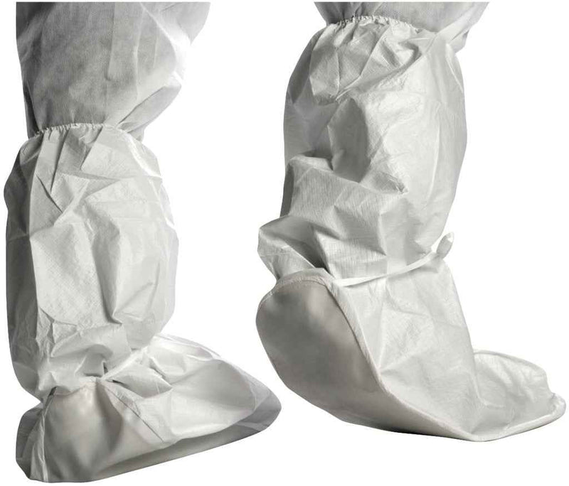 Elastischer Einweg-Überziehschuh aus mikroporösem PE-Laminat mit einer Anti-Rutsch-Sohle. Der Überziehschuh bedeckt den gesamten Fuss zum Schutz vor gesundheitsgefährdenden Partikeln und geringen Mengen an Flüssigkeitsspritzern.
