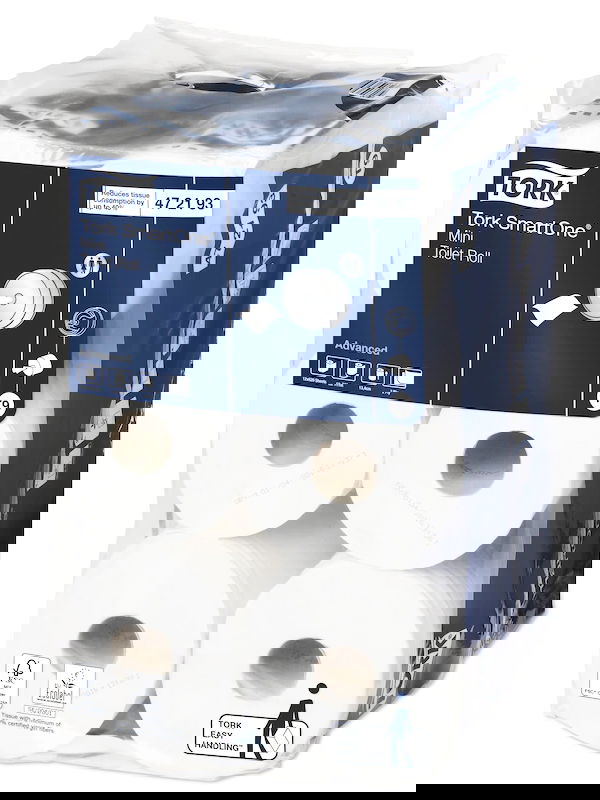 The SmartOne Mini toilet paper system, with its unique, hygienic single-sheet dispensing, helps reduce consumption by up to 40% compared to conventional toilet paper dispensers. This allows for more toilet visits per roll. Depending on the Tork SmartOne Mini dispenser chosen, Tork SmartOne Mini toilet paper rolls are suitable for demanding washroom environments with medium to high foot traffic.
